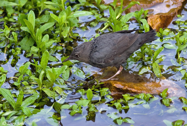 American Dippers are a very unique bird of the cold, fast streams in the Black Hills of South Dakota and western areas of North America. American Dippers feed on insects found on stream bottoms, swimming underwater to depths of up to 20 feet and even walking on the stream bed. They often nest on the underside of bridges over mountain streams.
