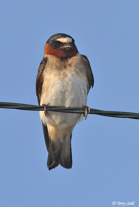 | ID Keys: Long forked tail, rusty brown throat and forehead, dark blue upperparts, white belly. | ||