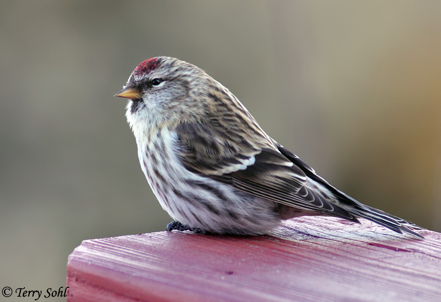 | ID Keys: Red cap, black chin patch, short stubby bill, pink wash on chest (male), dark brown streaks on sides | ||