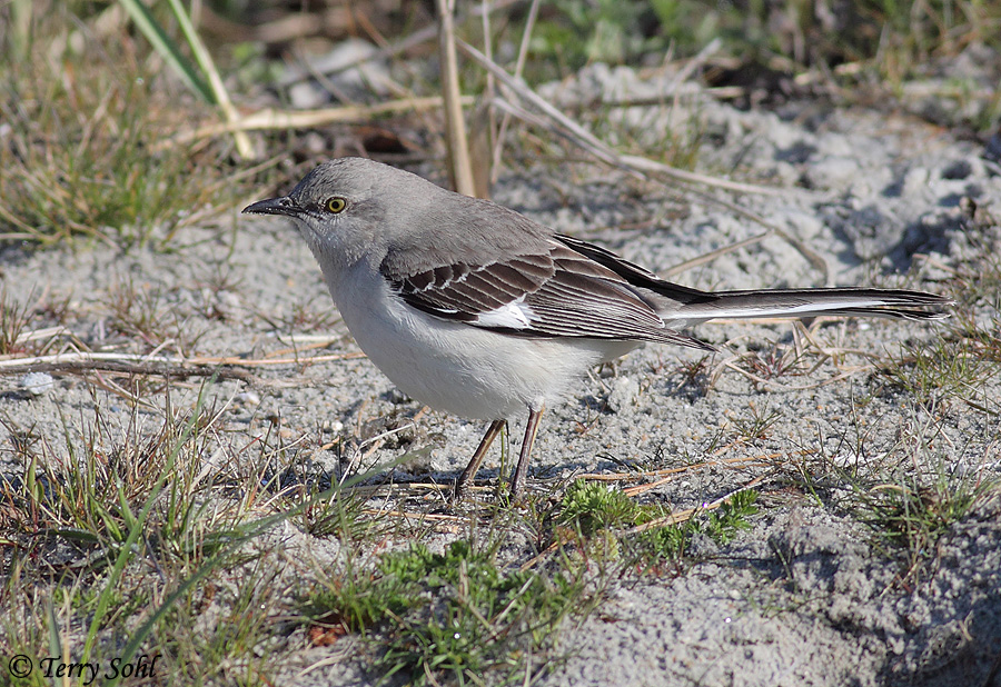 | ID Keys: Gray overall, white wing patches, long tail, short dark bill. | ||