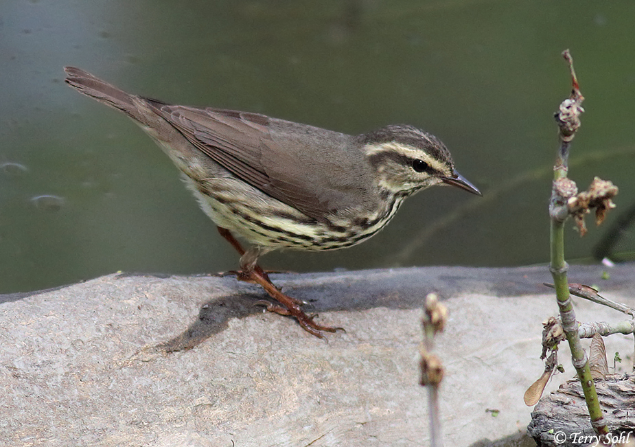 in thickets around streams and ponds, the Northern Waterthrush can often be seen