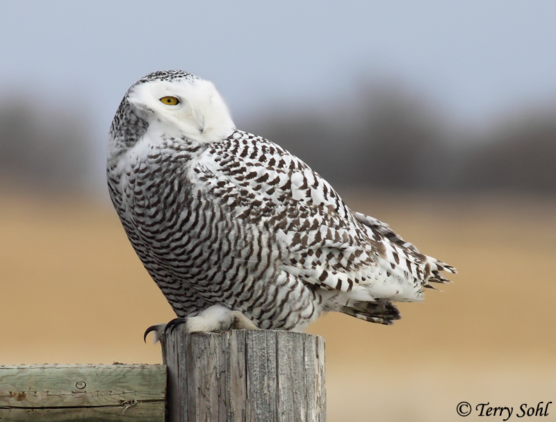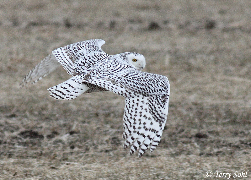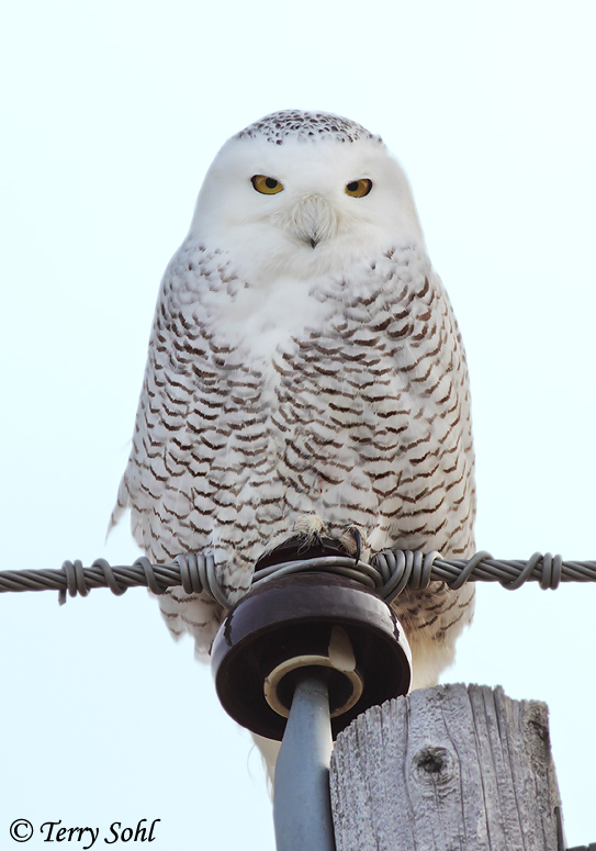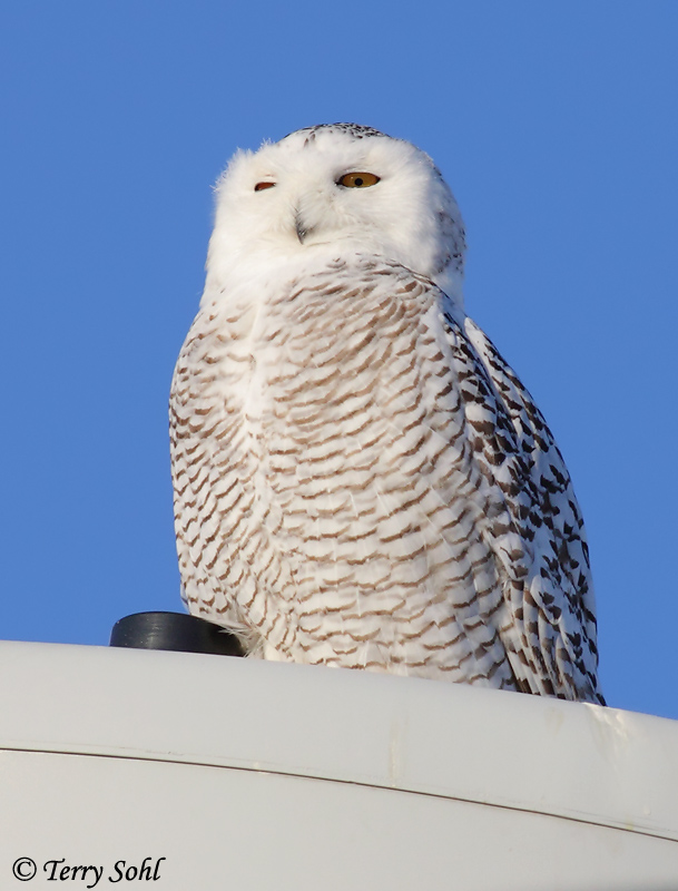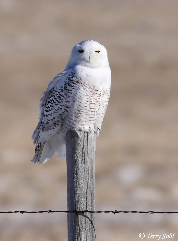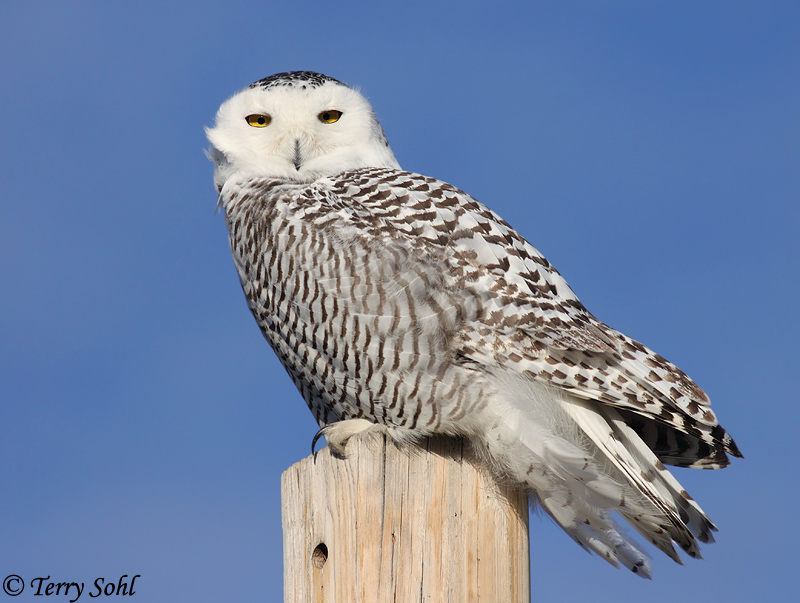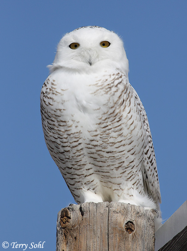 | ID Keys: All white plumage, females with dark barring. Lacks ear tufts. | ||