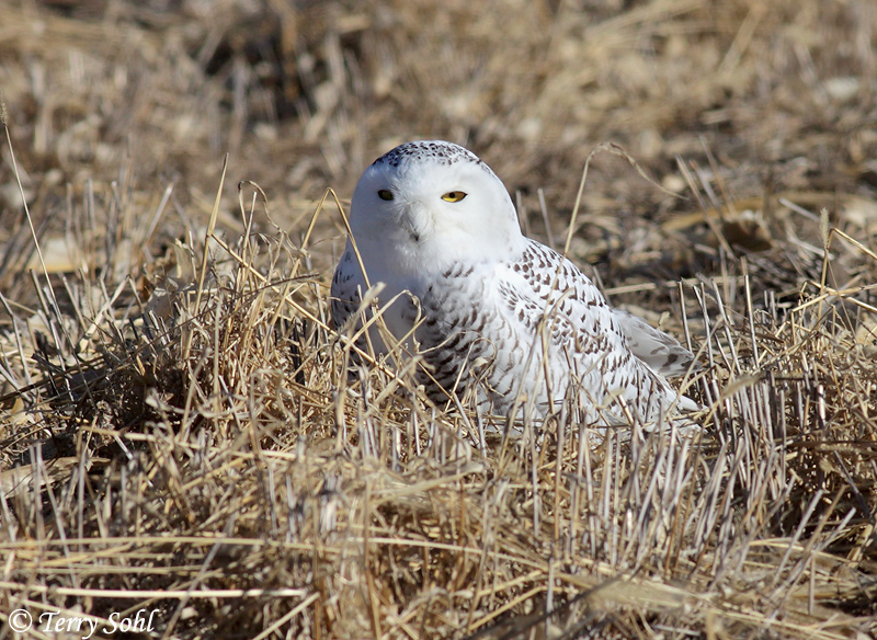 Non-breeder in South Dakota. In breeding range, the nest of a Snowy Owl is a raised area, typically a mound or hummock ont he tundra. The nest is a simple depression with no lining. The female lays between 3 and 10 eggs, with more eggs being laid when lemmings are more abundant. The female alone incubates the eggs. When the eggs hatch, the female stays with the young while the male brings food. The young fledge after about 8 weeks.