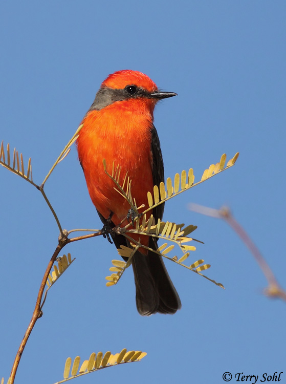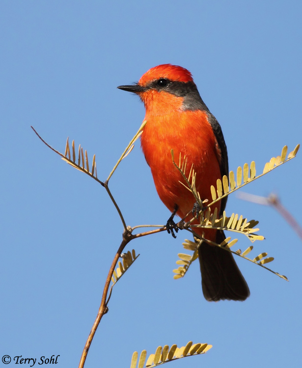 Flycatcher is brilliantly colored, with bright red underparts and head, with
