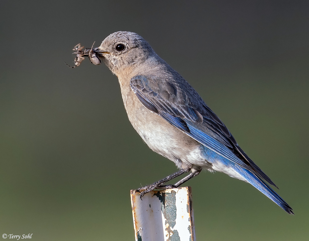 Female bluebird on fence post with freshly caught breakfast |
