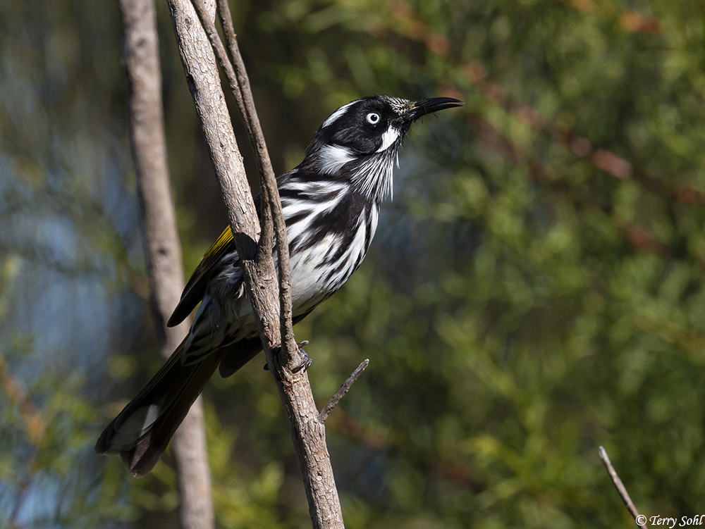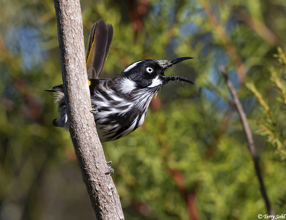 There were multiple species of honeybirds that we only saw in one specific location, but they seemed downright abundant in that spot. One of those species was the New Holland Honeyeater. While visiting the Blue Mountains west of Sydney, we came upon a forest clearing where these guys were numerous. The were flycatching bugs at the woodland edge, landing on perches and flying out to capture insects mid-flight. Seems like they were doing pretty good too! In some of the photos below you can see bits of insect left in their mouth.