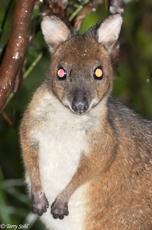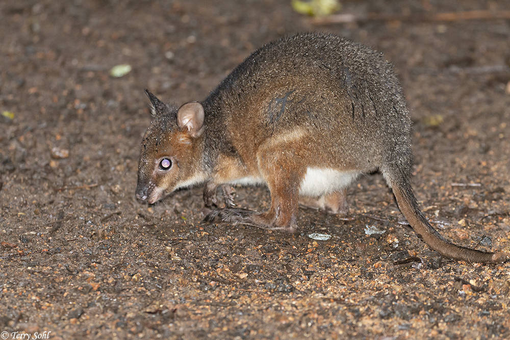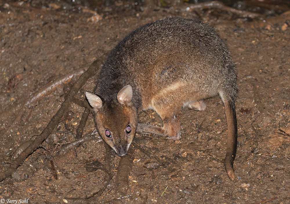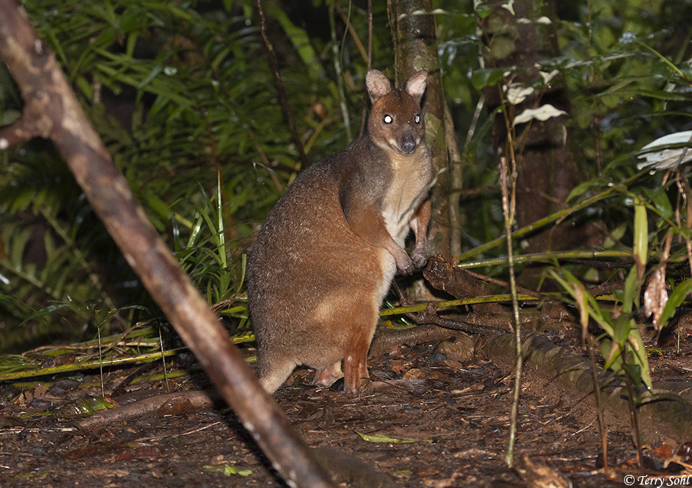 I don't know much about all the different kinds of kangaroos, wallabies, and other marsupial critters in Australia. I admit before arriving I hadn't ever heard of a "Pademelon". However, this is one critter we saw a lot of, while staying at the Rainforest Canopy Treehouses near Tarzali. They were always around our treehouse, day and night, but were pretty shy. During the day one would occasionally come by, but would be hiding at the edge of the clearing. At night they were more brave, presumably cleaning up any fallen fruit or seeds from our feeding the birds and possums.