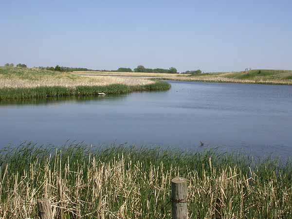 Open water and wetland vegetation can be seen on both sides of the gravel road at locations 2 and 3. These locations often offer tremendous viewing of waterfowl during migration, especially on the east side of the road where water is deeper. Shorebirds can be seen during the spring and fall on both sides of the road, but are probably more common on the west side of the road where the water is shallower. Large groups of American White Pelicans can often be seen foraging on the east side of the road in the spring. Various gull and tern species also can be spotted from this location at different times of the year.