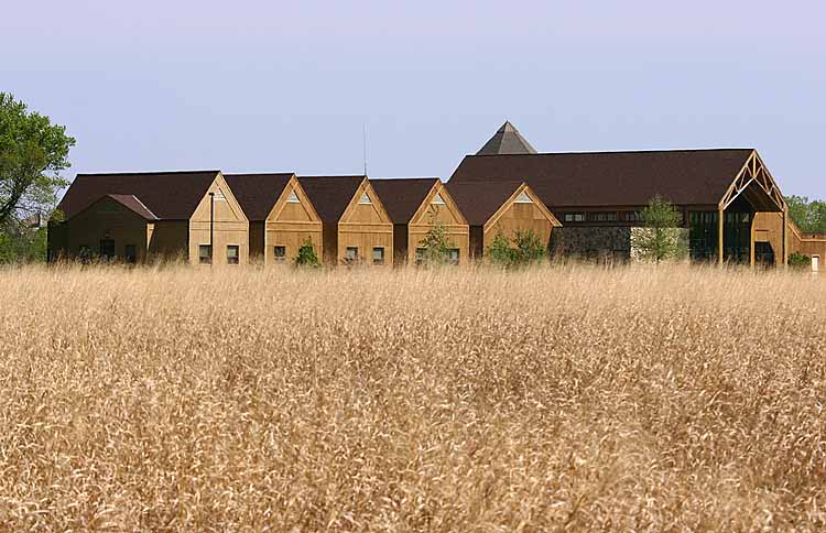 This view depicts the Outdoor Campus main building across the western grassland area. Many of the usual grassland species can be found along the trails going through the grasslands.