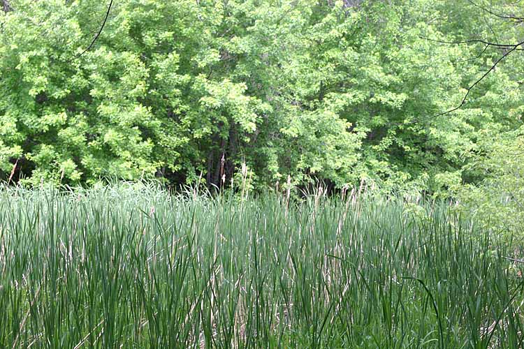 Another view showing the wetland vegetation around the sloughs, with the typical woodland in the background. The wetland vegetation may hide Green Herons, Sora, or American Bitterns.
