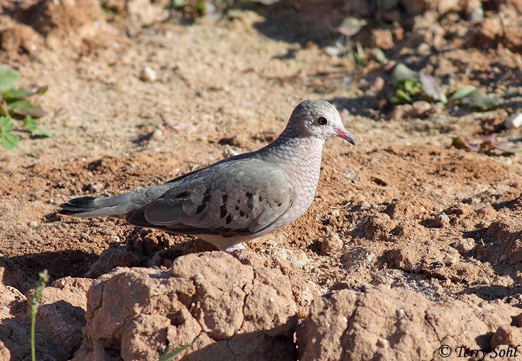| ID Keys: Scaled feather pattern on chest and head, short tail, bill pink at base, bright rusty red under wings in flight | ||