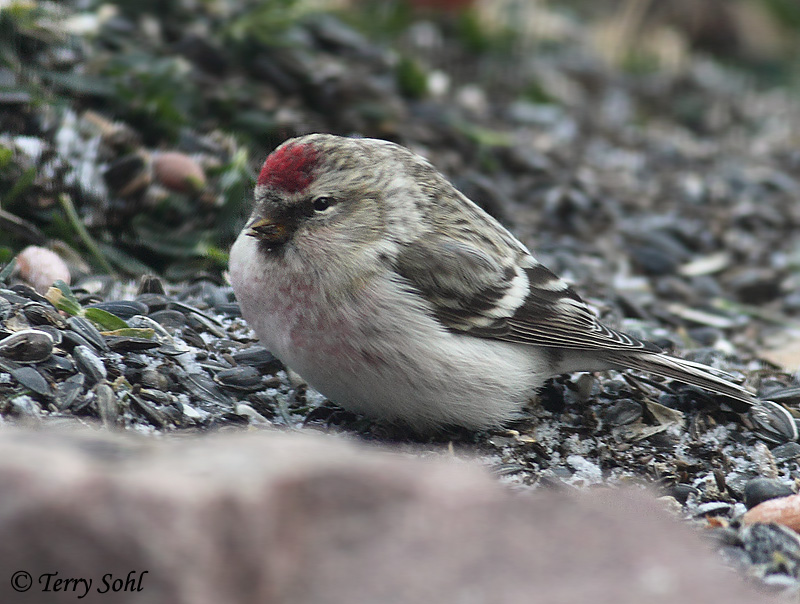 | ID Keys: Red cap, black chin patch, very short stubby bill, pale grayish upperparts, whitish underparts. | ||