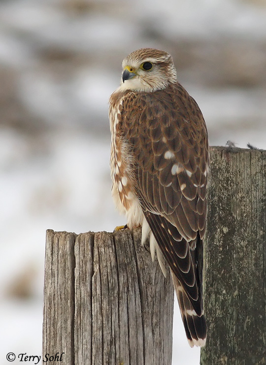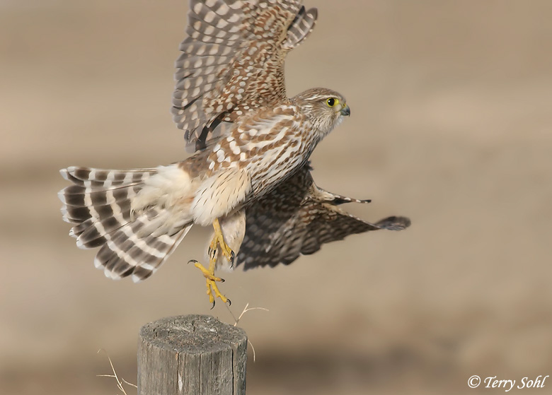 Merlins mostly feed on small birds, but sometimes they will also take small mammals, insects, and reptiles. They will feed on whatever variety of birds may be found near their nesting sites during the summer breeding season, but in migration and winter months, they may specialize on one or a few species. I've often seen them following mixed flocks of Horned Larks, Lapland Longspurs, or Snow Buntings during the winter months in South Dakota. They'll take birds as small as a sparrow or as large as a pigeon.
