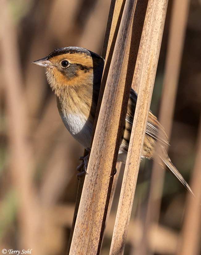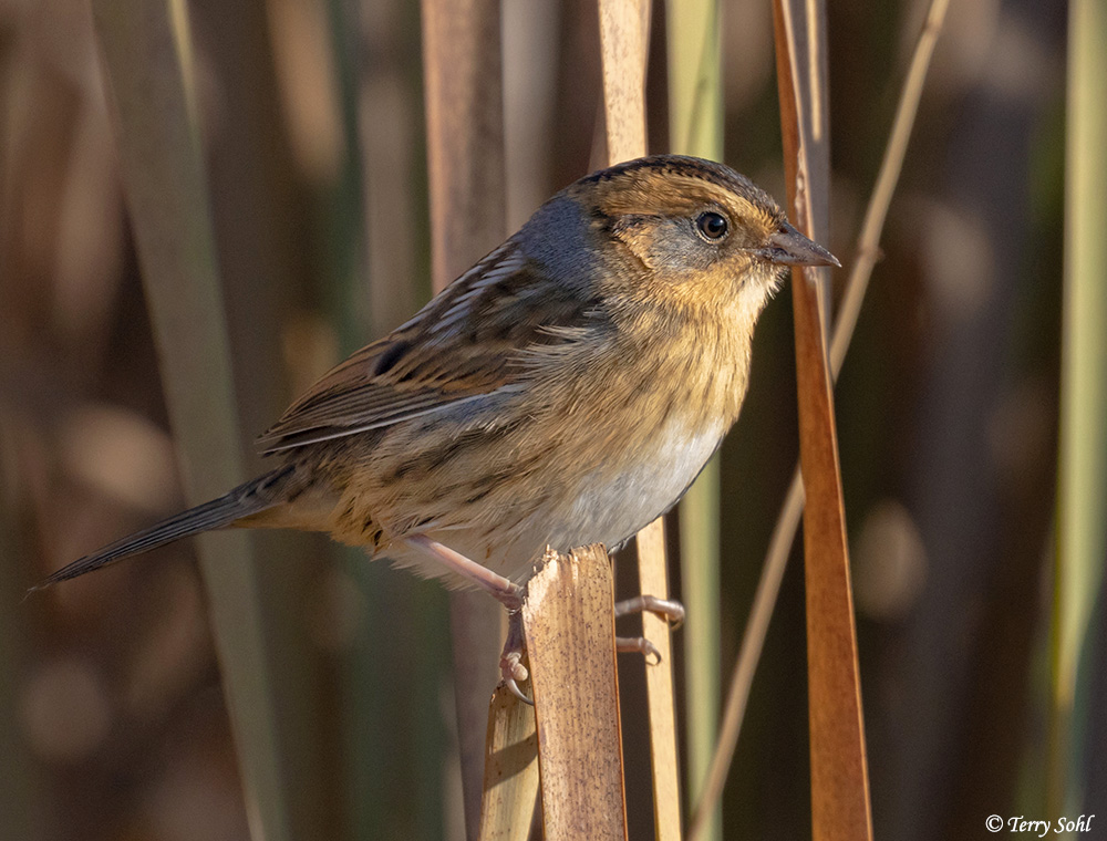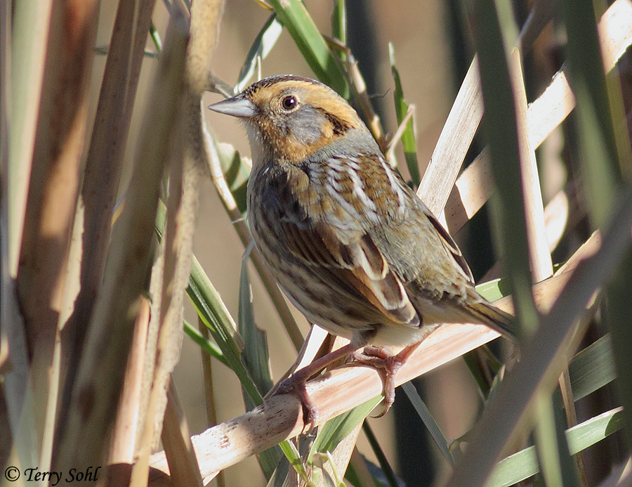 The song of a Nelson's Sparrow is a wheezy hissing p-tsssssshhhuk. They also have a muted metallic tik call. Unlike some species that often perch in a higher and more visible location when singing, male Nelson's Sparrows often sing from the same dense wetland vegetation where they nest, making them a species that is often difficult to observe. They sing both day and night.