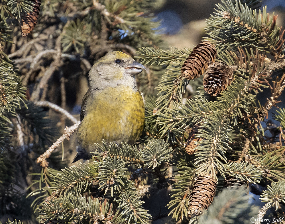 Red Crossbills are also a species with a great geographic diversity in songs and other minor characteristics. Depending on the source, there are 8 to 11 recognized sub-species (with constant rumors that they're about to be split into full, distinct species). "Type 2" Red Crossbills, sometimes called the "Ponderosa Pine Crossbill" (the bendirei or benti subspecies, depending upon source), is the one commonly found in the Black Hills, and in similar habitats further west in the United States. They're also the most likely subspecies to be found as winter visitors in the state. However, several of the other subspecies also have a tendency to sometimes stage winter irruptions, and spread widely from their core breeding areas. Type 3 and Type 4 Red Crossbills (the "Western Hemlock" and "Douglas Fir" subspecies, respectively) for example, both have a core breeding area near the Pacific coast of North America, yet sometimes irrupt all the way through the Great Plains. Thus, unless clear vocalizations are heard, it can be difficult to judge with any certainty which subspecies is being seen in winter in most locations in South Dakota.