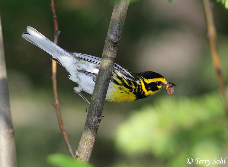 This photo of a Townsend's Warbler was taken on July 2nd, 2011 near Glacier National Park in Montana. It was fun watching this male forage right in front of me, rather low in the vegetation, as he looked for food to feed young. I don't think it's that normal for them to forage so low in the canopy. Photo taken with Canon 50D, 400 5.6L.